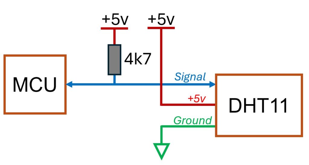 In the DHT11 module, an inbuilt controller provides a serial data transfer facility. A 4k7 pull-up resistor is used between +Vcc and Signal. The connection diagram is shown in Fig. 2